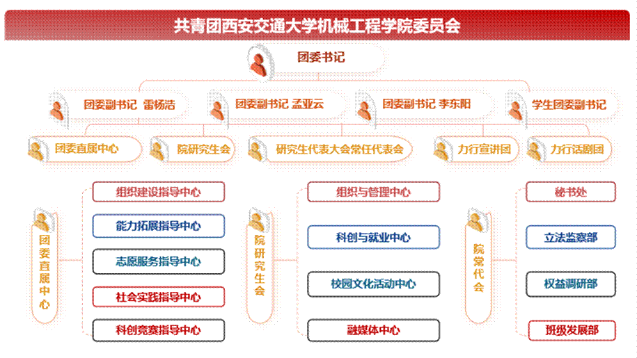 院团委设置团委书记1名、副书记3名、学生副书记5名。院团委下设5个直属中心,负责新葡的京集团4321团组织的思想引领、组织建设、科创实践与考核评优等工作,为学院基层团组织提供指导和服务。同时指导学院研究生会、研究生代表大会常任代表会和力行宣讲团开展工作。各直属中心主要职能如下: