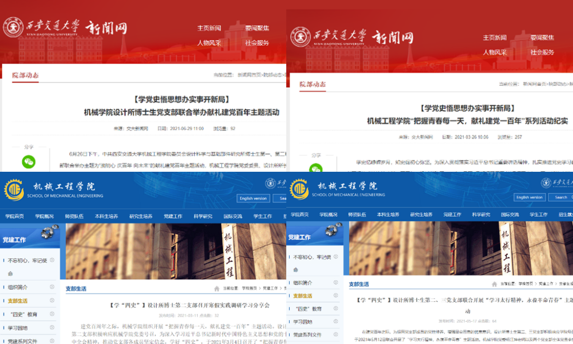 在新闻宣传方面,设计所博士生第二党支部被学院官网和学院微信公众号报道5次,其中“把握青春每一天,献礼建党一百年”主题学习实践活动和“溯初心·庆百年·向未来”迎接建党百年师生联合活动被学校新闻网报道。在优秀党员宣传方面,邀请学院雷亚国教授、董光能教授和林起崟副教授为大家做主题为“科研与党建——迎接建党百年”的报告,邀请支部内高年级优秀党员邢赛博和徐婵同志做主题为“优秀党员是如何科研、生活和规划未来”的报告。此外,积极宣传迎接建党百年活动,在国庆节来临前夕挂国旗贴标语营造热烈的国庆氛围,带动普通学生群体一起参与到迎接建党百年和国庆节的活动中来。