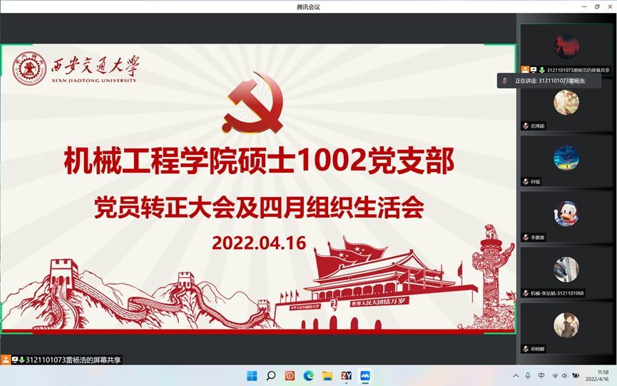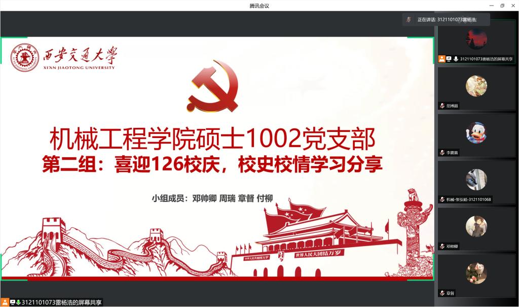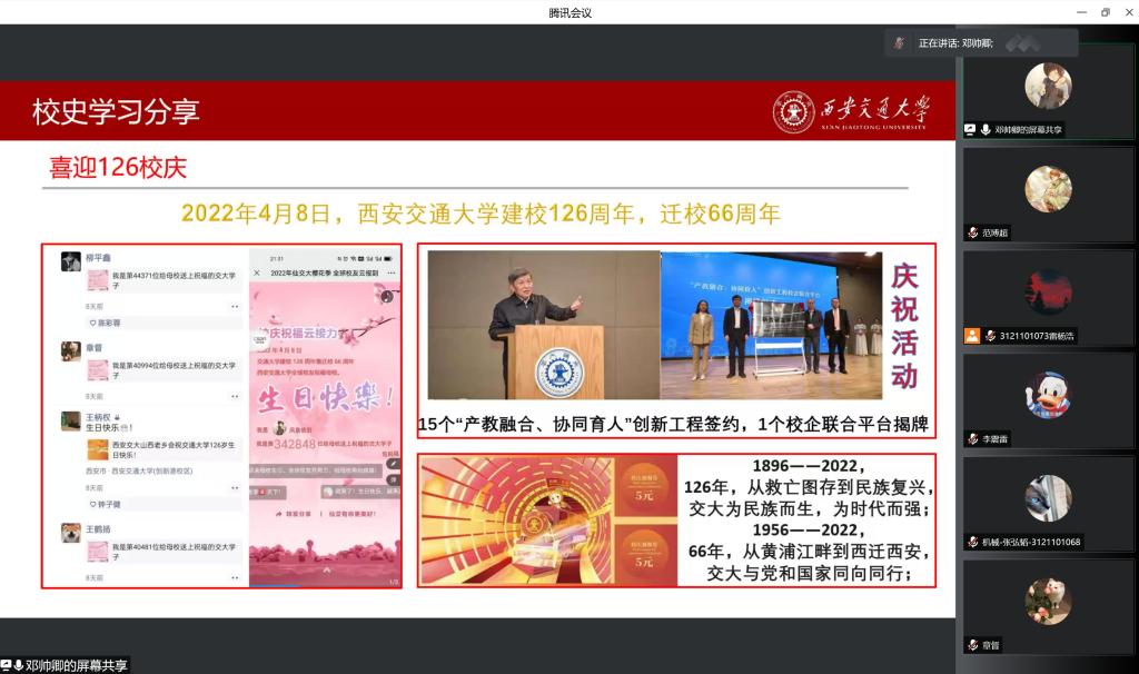 为庆祝新葡的京集团4321126周岁生日、传承弘扬西迁精神、向同学们充分展现交大126年办学历程,本支部于2022年4月16日在线上举行了本月的组织生活会,组织支部同志学习交大历史,为母校庆生。