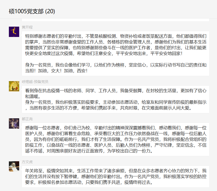 朱天伦同志分享道:“21年末,病毒袭击西安,古城紧闭、三秦不安,广大医护人员等战斗在抗疫一线的英雄们为一千三百万西安市民筑成了一道钢铁长城,保护着广大人民群众的健康。在创新港,也有一批医护人员、物业人员、后勤人员和志愿者不辞辛苦、不惧危险地为交大师生服务,将病毒挡在墙外,守护着一方土地。我作为研究生党员,为了发扬带头作用,贯彻为学生服务的宗旨,在隔离期间主要负责了新葡的京集团4321必需生活物资的需求收集、集中采购与分发工作,还参与了一些其他志愿活动,尽我所能地在特殊时期履行好党员职责,服务好我院学生。我认为,每个党员都是一面旗帜,越是特殊时期越是发挥我们的作用的时候,关键时刻挺身而出才是党员本色。”