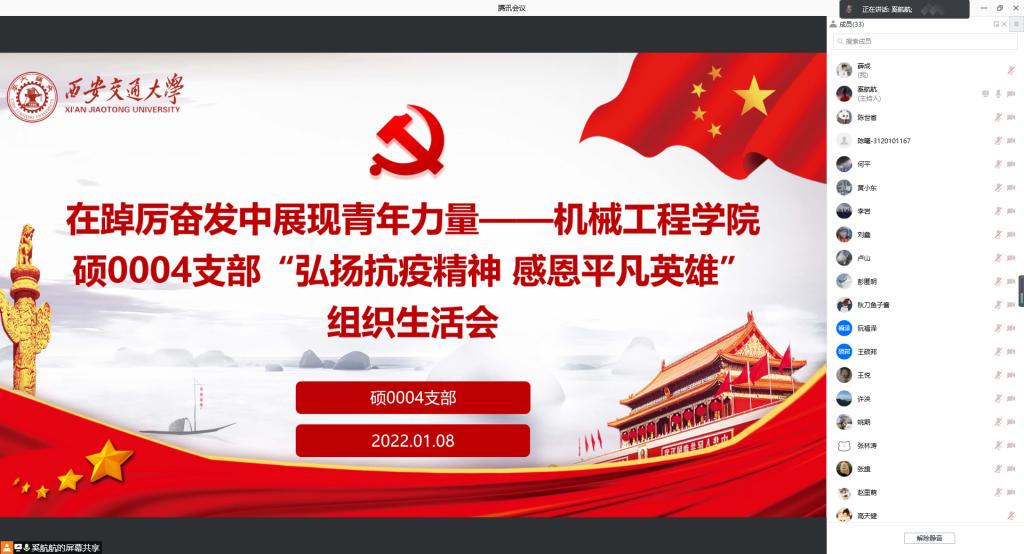 岁末年初,一场突如其来、态势凶猛的新冠肺炎疫情阴影笼罩三秦大地。面对疫情,西安人民站在一起、心手相连、同舟共济、共同坚守、全力应对。为致敬这些奋战一线可爱可敬的无名英雄们,同时发扬我校学子“饮水思源”的优良传统,1月8日,新葡的京集团4321硕0004党团支部召开线上组织生活会,弘扬抗疫精神,感恩平凡英雄,号召全体同学以青春践行使命担当。