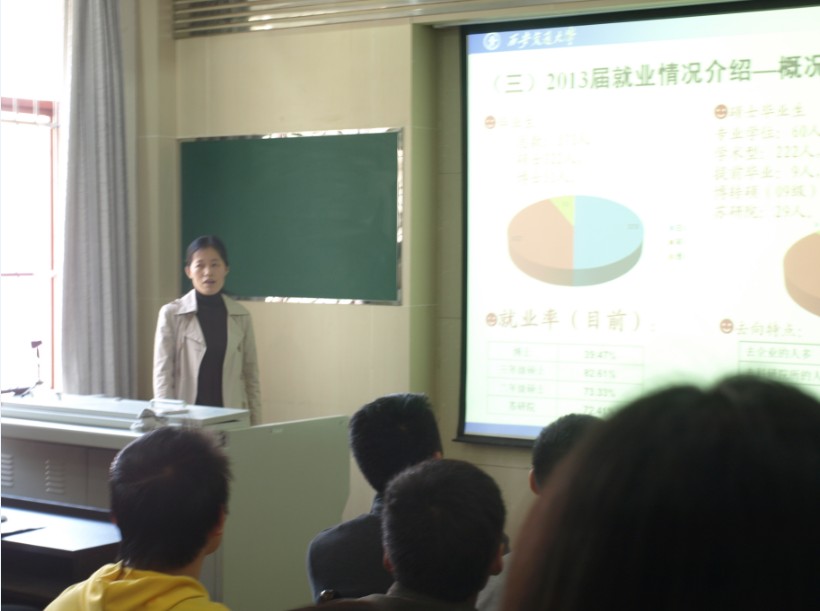 首先,雷老师对2012届和2013届毕业研究生的就业情况图表并茂,分门别类的进行了详细介绍。根据最新统计数据,在370名2013届毕业研究生(硕、博)中,硕士签约率达到80%以上。与去年相比,今年的就业去向特点仍然是:去企业的人最多(超过5成),其次是去科研院所(超过3成)。近年来,在就业形势日趋严峻的情况下,新葡的京集团4321研究生的就业质量稳中有升,就业前景持续乐观。
