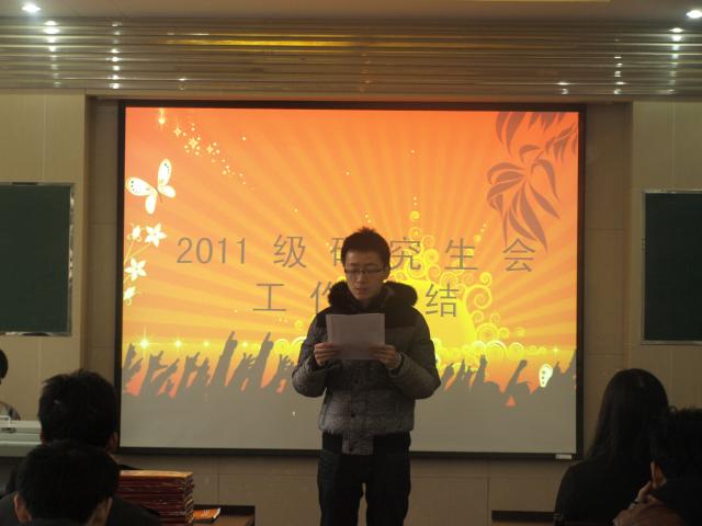 会议由本届研究生会秘书长王佳同学主持。会上,訾艳阳教授做了讲话。他首先对新葡的京集团4321研究生会近两个多月的工作做出了充分肯定,对个人以及集体在学校学院活动中所表现出的工作热情提出表扬。特别是在“中华之声”合唱比赛中,同学们所表现出的耐心、热心、激情及凝聚力深深地令他感动。随后,訾老师对合唱比赛的经验教训做出了总结。同时强调同学们一定要重视课业,努力学习,为科研做出贡献。