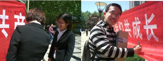 四月芳菲,春雨绵绵。2011年4月23日,新葡的京集团4321硕901党支部在康桥苑举办 “三年奋斗,三年展望,90年我们共成长” 纪念建党90周年大型条幅签名活动。上午9点,支部成员在康桥苑门前拉起了字幅,康桥苑是人流较多的地方,继而邀请过往的同学和老师以签名的形式来普及有关方面的知识。现场气氛很活跃,本次活动得到了同学和老师的支持,他们积极的参与其中留下自己的名字和对党生日的祝福。值得指出的是,由于现场互动的比较好,不仅仅在校的老师和同学积极参与其中;很多校外的路过的群众也参与了这次签名活动。