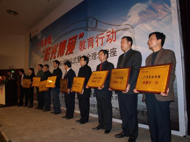 捐赠仪式上,广汽丰田公司综合管理部张华部长首先阐述了在丰田公司汽车勇于承担社会责任的理念,2007年丰田公司启动了“阳光博爱”教育行动,包括阳光助学金、小学捐建等活动,搭建学校与企业合作桥梁,为社会培养更多优秀汽车人才。