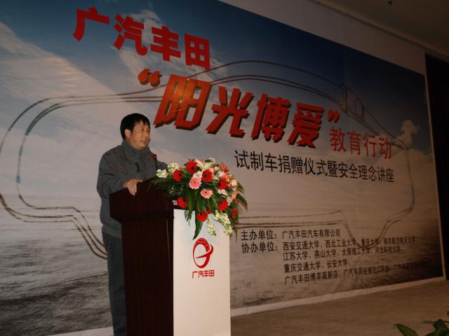 捐赠仪式后,丰田公司研发中心谭为科长作了安全理念讲座,介绍了汽车安全发展史和安全技术及法规,并对丰田汽车的安全理念和安全技术进行了解释说明。