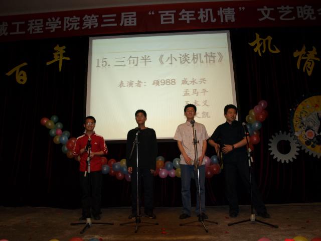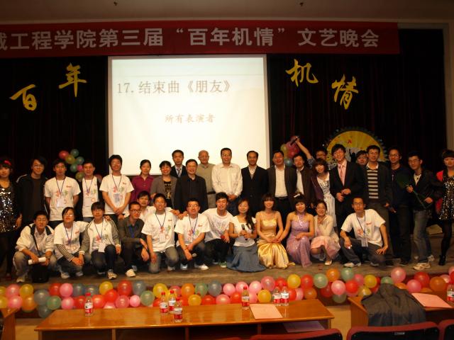 2010年4月28日,新葡的京集团4321师生欢聚一堂,在逸夫科学馆101报告厅举办第三届“百年机情”大型文艺晚会。校学生处处长徐文雄老师,组织部部长陈天宁老师,研究生院副院长李秀兵老师,学院副院长赵万华老师,党委副书记訾艳阳老师和学院系所、院办部分老师及学院研究生400余人到场观看了演出。