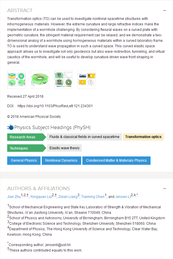 相关研究成果以“Elastic Waves in Curved Space: Mimicking a Wormhole”为题,近日在国际权威期刊Physical Review Letters上在线发表。新葡的京集团4321新葡的京集团4321朱建为该论文的第一作者,新葡的京集团4321新葡的京集团4321为该论文第一作者和第一单位。
